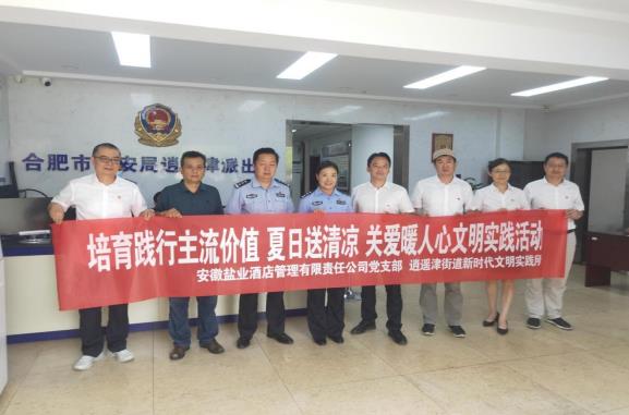 炎炎高溫送清涼,親切慰問暖警心,一聲親切的問候,一瓶清涼的礦泉水,表達(dá)著對一線勞動者的敬意。8月10日下午,酒店管理公司黨支部的黨員志愿者們,在逍遙津街道文明辦鐘主任的陪同下,來到合肥市廬陽區(qū)逍遙津派出所,看望慰問辛勤堅守在第一線的基層民警們,并為他們送去礦泉水、防暑降溫包等慰問品,感謝他們在維護(hù)轄區(qū)治安秩序和諧穩(wěn)定等方面做出的突出貢獻(xiàn)。
