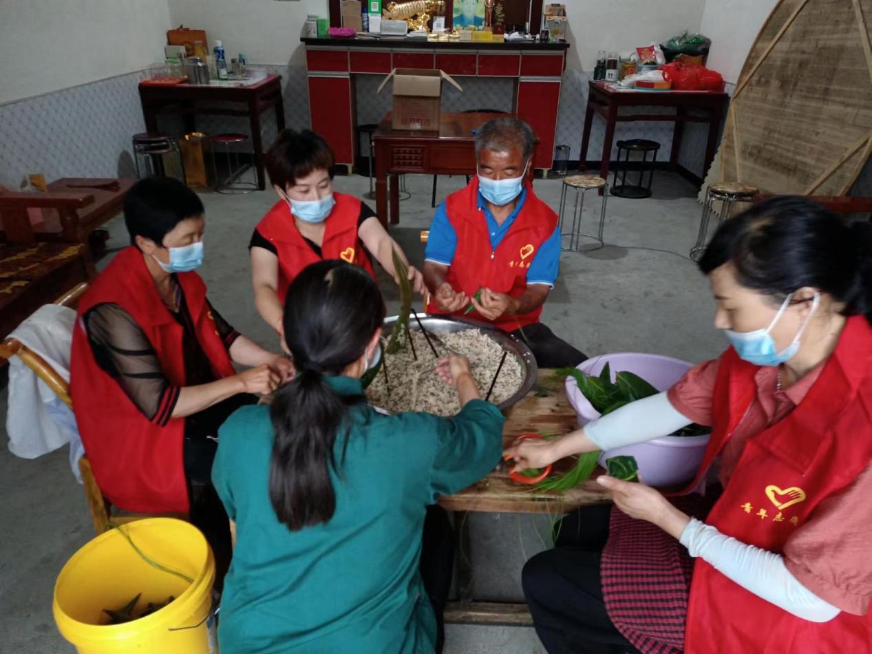 慰問前,集團駐村工作隊隊員和村干部驅車到塔畈鄉(xiāng)政府街道市場,采購包粽子用的優(yōu)質(zhì)糯米、綠豆、豬肉等原材料后,又步行到仙姑潭,采摘了天然野生的鮮粽葉和捆扎粽子的龍須草。精心準備好食材后,6月1日上午,工作隊隊員和部分村干及志愿者來到炳峰茶廠,在包粽子能手凌大姐的指導示范下學習包粽子、蒸粽子。下午,駐村工作隊和村兩委組成兩個慰問小組,深入18戶五保老人家,仔細詢問他們的身體狀況、家庭情況以及存在的困難訴求,為他們送去了剛蒸好的熱粽子、綠豆糕、牛奶等慰問品。