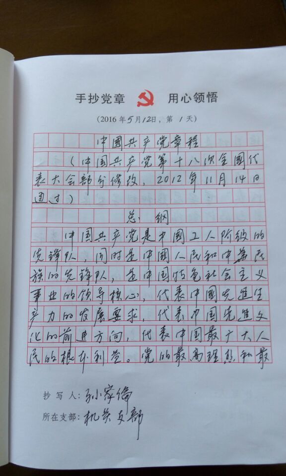 公司黨委統(tǒng)一印制了專門的抄寫本,要求每個(gè)在職黨員按每天抄寫150字的速度用100天抄寫完畢。做到每天堅(jiān)持,在手抄黨章的過(guò)程中,逐句逐字研讀黨章,自覺(jué)尊崇黨章,遵守黨章,維護(hù)黨章,進(jìn)一步增強(qiáng)黨性觀念,做合格黨員。