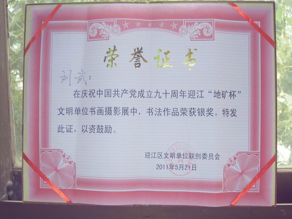 樅陽公司劉武同志書法作品獲銀獎(jiǎng)