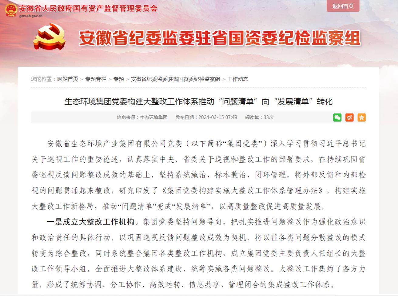 近日,安徽省國(guó)資委網(wǎng)站-安徽省紀(jì)委監(jiān)委駐省國(guó)資委紀(jì)檢監(jiān)督組專欄發(fā)布了《省生態(tài)環(huán)境集團(tuán)黨委構(gòu)建大整改工作體系推動(dòng)“問題清單”向“發(fā)展清單”轉(zhuǎn)化》,以下為全文。