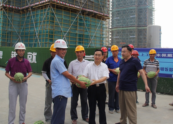 王思軍頂著烈日、冒著酷暑來到六安項目在建工地,與施工人員親切交談,詳細了解防暑降溫工作保障情況,將綠豆、西瓜、毛巾、清涼油等防暑降溫物品送到一線職工手中,希望各參建單位通力合作,全力實現(xiàn)人員安全、施工安全和質量安全。