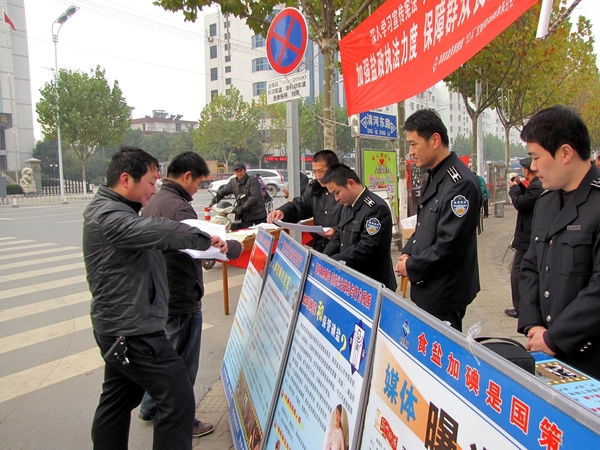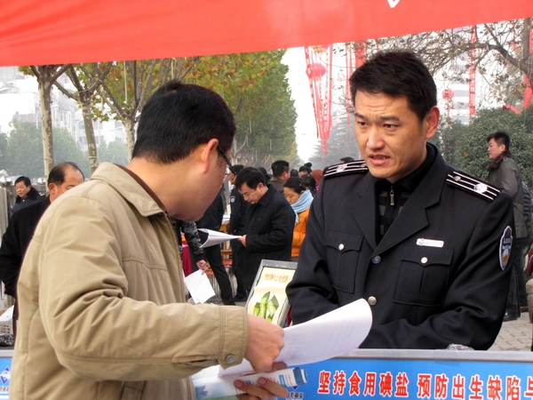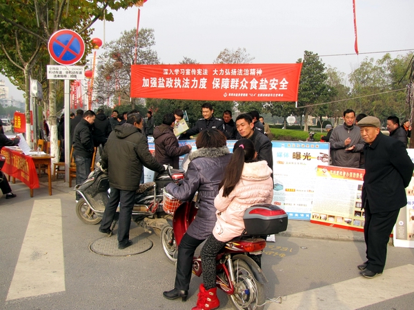 阜陽市鹽務(wù)局高度重視此次宣傳活動(dòng),結(jié)合自身業(yè)務(wù)范疇,精心準(zhǔn)備大量法制宣傳資料。早晨7時(shí),天氣陰冷,寒風(fēng)勁吹,我局鹽政執(zhí)法人員在副局長王道亞的帶領(lǐng)下,早早地布置好法制宣傳臺(tái)。在活動(dòng)現(xiàn)場王道亞親自向過往群眾宣傳鹽政法律法規(guī)知識(shí),宣傳消費(fèi)者、經(jīng)營者的權(quán)利和義務(wù),宣傳消費(fèi)者如何依法維權(quán);進(jìn)行了假冒偽劣食鹽展示和鑒別;開展了涉鹽咨詢、受理投訴舉報(bào)。此次宣傳共發(fā)放宣傳資料500余份,接受群眾咨詢200余人次。活動(dòng)現(xiàn)場布置了咨詢展臺(tái),擺放宣傳圖板10塊、宣傳展架3個(gè)、懸掛 2條生動(dòng)主題橫幅,展示了近期查獲的部分劣質(zhì)私鹽樣品,教市民辨別真假碘鹽的活動(dòng),咨詢臺(tái)前觀看宣傳圖版和前來咨詢的群眾絡(luò)繹不絕,受到了親自趕赴現(xiàn)場慰問的市人大常委副主任李新才、市政府副市長黃珍、市政協(xié)副主席張永俠、市委宣傳部、市司法局和市依法治市領(lǐng)導(dǎo)小組辦公室有關(guān)領(lǐng)導(dǎo)以及廣大群眾的一致好評(píng)。