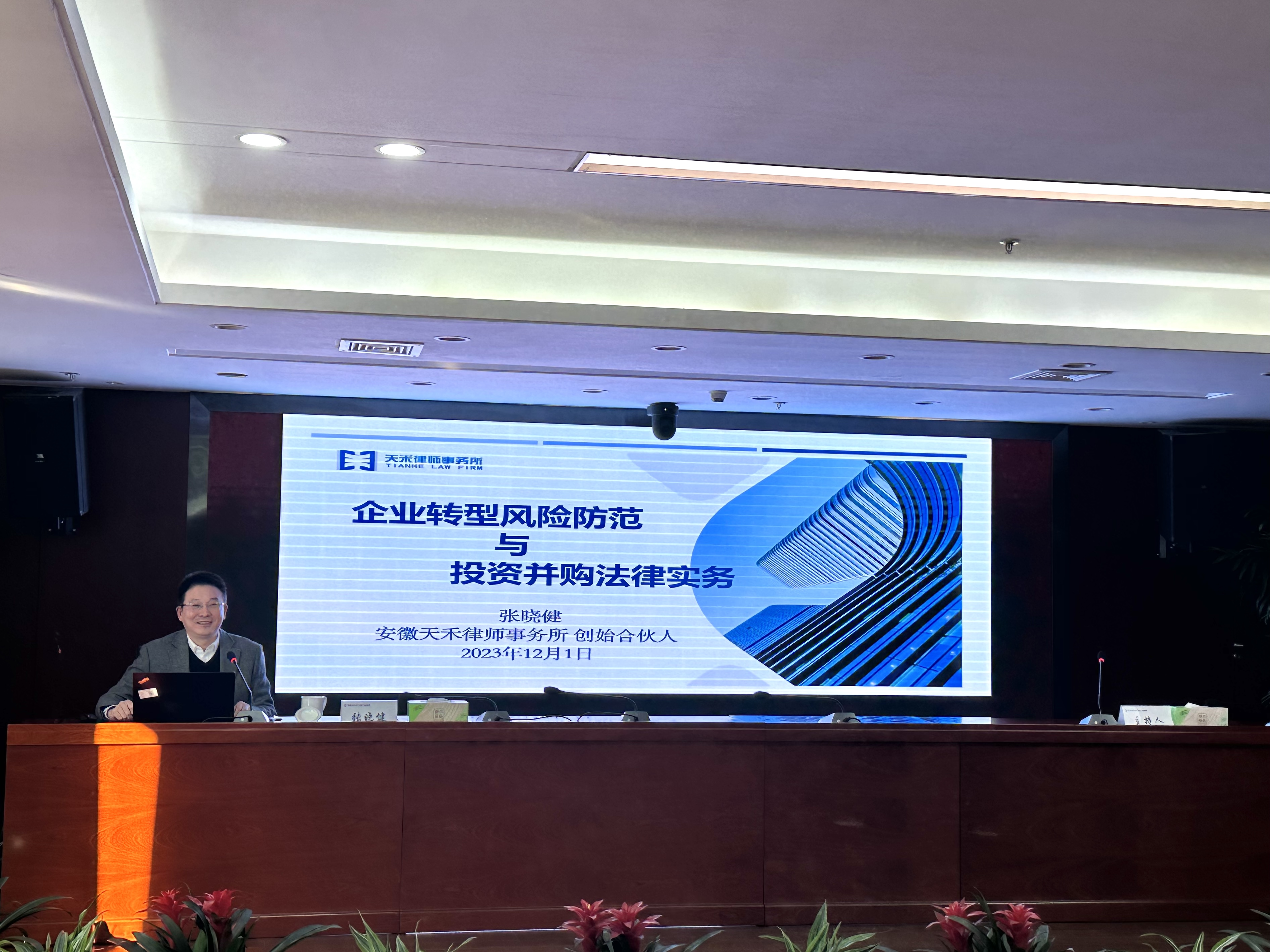培訓旨在弘揚憲法精神、培養(yǎng)員工合規(guī)管理意識、推動集團強化對投資并購問題集中領域的管控,防范和減少相關風險。安徽省人民政府法律顧問、安徽天禾律師事務所創(chuàng)始合伙人張曉健以“企業(yè)轉型風險防范與投資并購法律實務”為題展開專題講座。