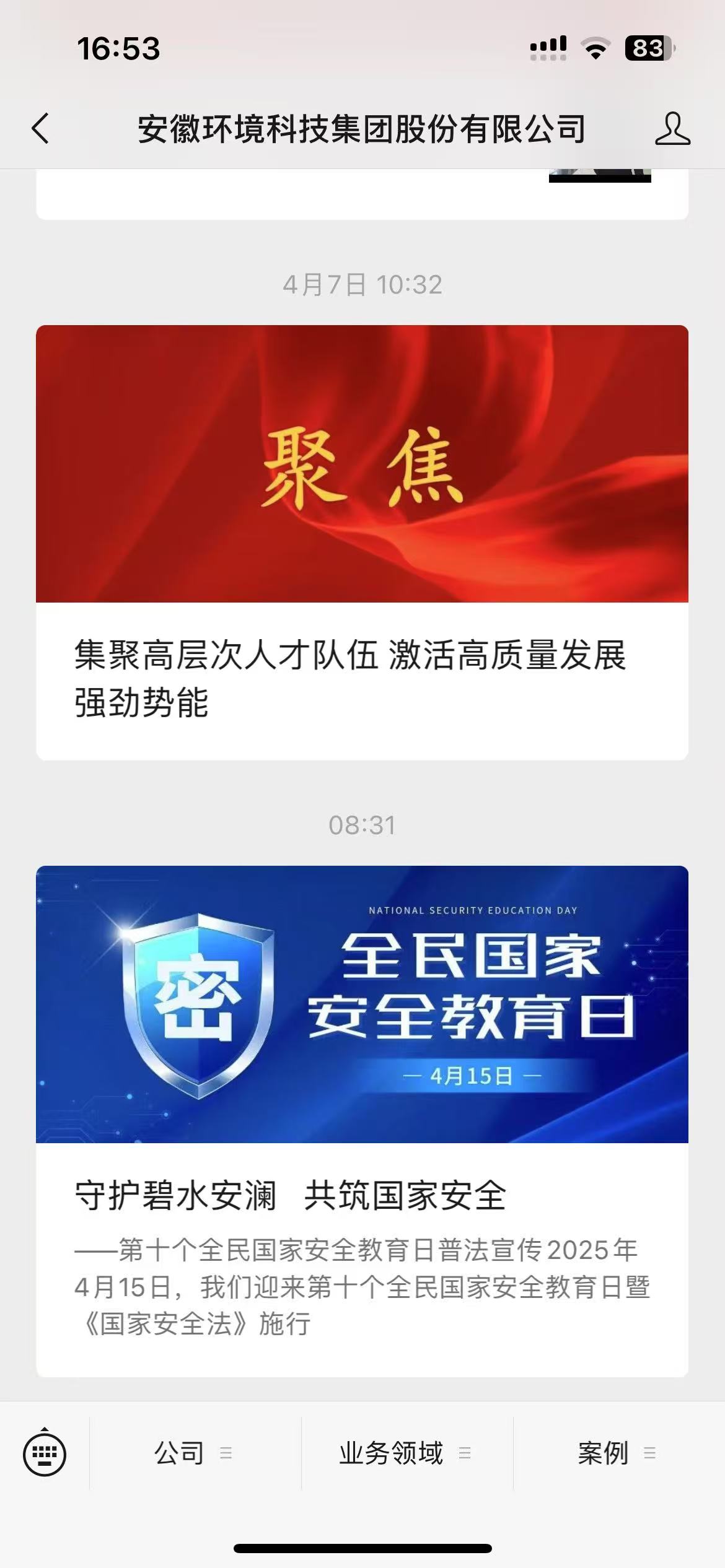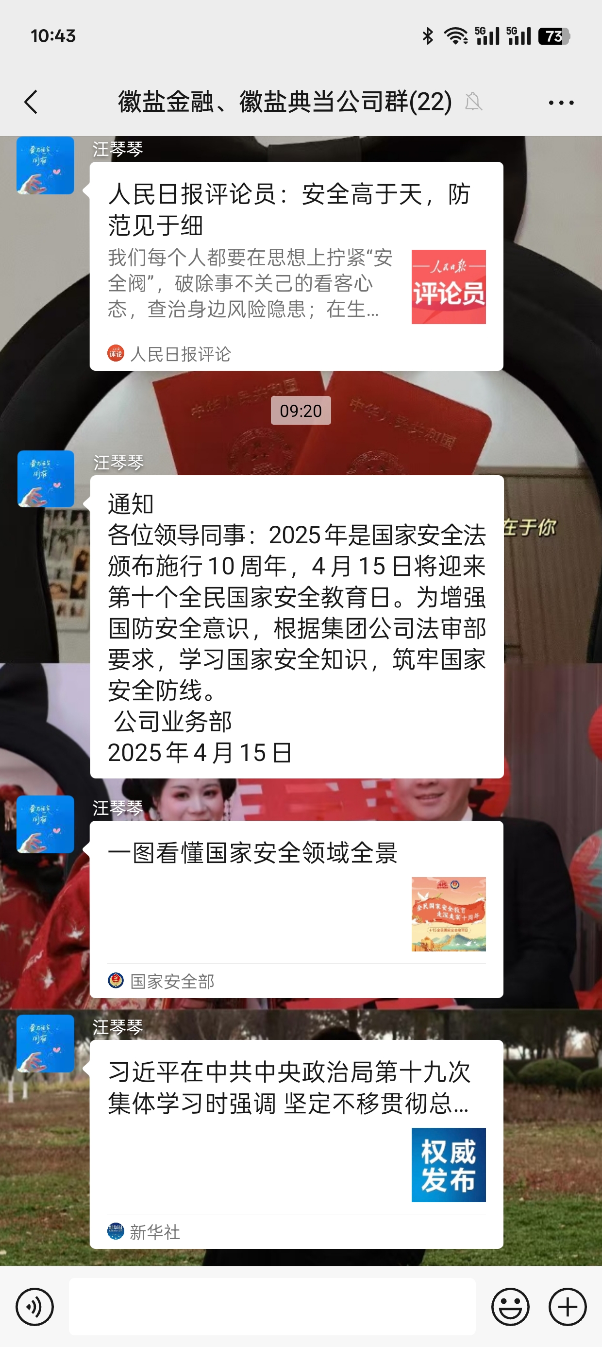 地產(chǎn)集團微信群每日推送國家安全知識圖解、微視頻,以“碎片化學(xué)習(xí)”提升普法滲透力;集團公司、環(huán)境科技集團微信公眾號發(fā)布專題推文《國家安全,你我同行》,通過案例剖析、法條鏈接等形式,生動解讀《國家安全法》《反間諜法》;徽鹽金融等子公司組織線上答題活動,覆蓋全員,以考促學(xué)鞏固國家安全基礎(chǔ)知識,參與率達100%。