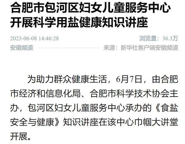 6月8日,新華社客戶端安徽頻道發(fā)表題為《合肥市包河區(qū)婦女兒童服務(wù)中心開(kāi)展科學(xué)用鹽健康知識(shí)講座》的文章,截至發(fā)稿日瀏覽量達(dá)40.7萬(wàn)人次。