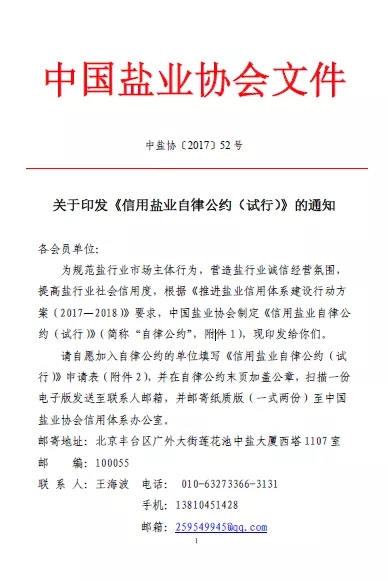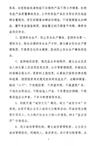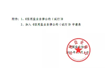 2017年11月6日,為規(guī)范鹽行業(yè)市場(chǎng)主體行為,營造鹽行業(yè)誠信經(jīng)營氛圍,提高鹽行業(yè)社會(huì)信用度,中國鹽業(yè)協(xié)會(huì)制定《信用鹽業(yè)自律公約(試行)》。該《自律公約》從守法合規(guī)、確保食鹽質(zhì)量與安全、防止安全生產(chǎn)事故、堅(jiān)持誠信經(jīng)營、開展誠信文化建設(shè)、設(shè)立誠信管理機(jī)構(gòu)等6方面進(jìn)行行業(yè)自律。各食鹽定點(diǎn)批發(fā)企業(yè)、食鹽定點(diǎn)生產(chǎn)企業(yè)和中國鹽業(yè)協(xié)會(huì)會(huì)員單位可自愿加入信用鹽業(yè)自律公約。