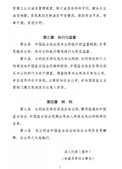 對(duì)違反公約第四條 1 款的(守法合規(guī)),依法處理,依規(guī)執(zhí)行,對(duì)不履行鹽行業(yè)自律義務(wù),有損行業(yè)和他人利益的行為,視情節(jié)輕重采取通報(bào)、降低信用等級(jí)直至取消會(huì)員資格。