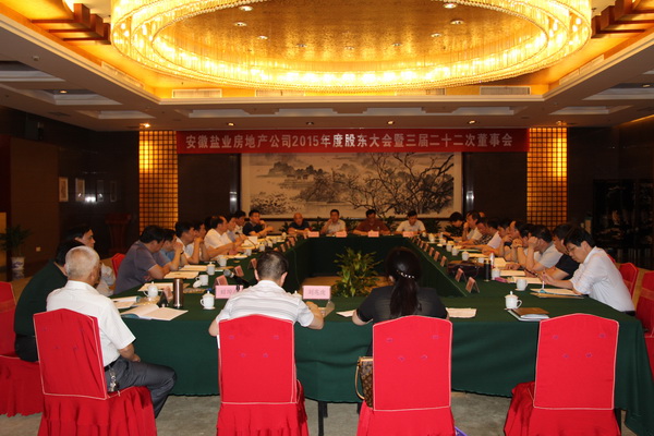 5月25日下午,徽鹽地產(chǎn)2015年度股東大會暨第三屆董事會第二十二次會議在合肥梅山飯店隆重召開。徽鹽地產(chǎn)全部19家股東代表、全體董事、監(jiān)事及公司經(jīng)營班子全體成員出席會議。省公司總經(jīng)理、徽鹽地產(chǎn)董事長詹先豪主持大會,省公司副總經(jīng)理、徽鹽地產(chǎn)董事楊曉彬代表領導班子作工作報告。