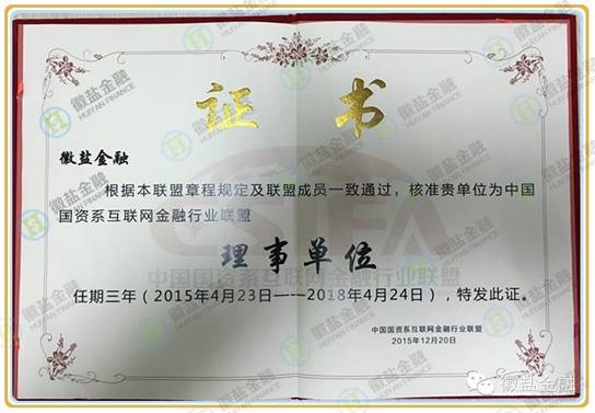 2015年12月20日,中國國資系互聯(lián)網(wǎng)金融行業(yè)聯(lián)盟(簡稱“國金聯(lián)盟”)第五次理事大會在長沙舉行。屆時,徽鹽金融正式加入國金聯(lián)盟,成為其理事單位。