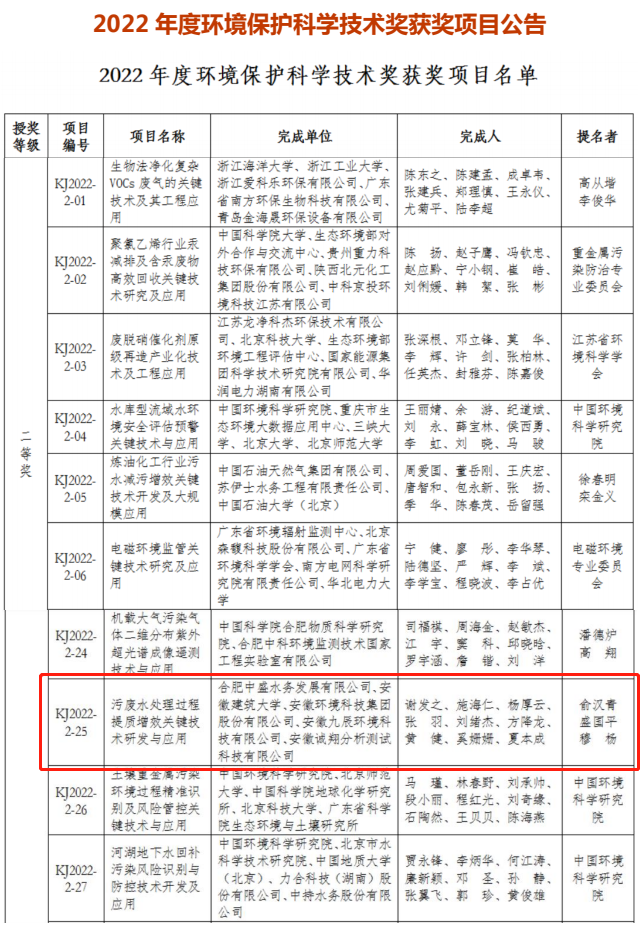 近日,中國環(huán)境科學(xué)學(xué)會對外發(fā)布了2022年度環(huán)境保護(hù)科學(xué)技術(shù)獎(jiǎng)獲獎(jiǎng)名單,由安徽環(huán)境科技集團(tuán)與合肥中盛水務(wù)、安徽建筑大學(xué)等單位共同研發(fā)攻關(guān)的技術(shù)成果“污廢水處理過程提質(zhì)增效關(guān)鍵技術(shù)研發(fā)與應(yīng)用”榮獲二等獎(jiǎng)。