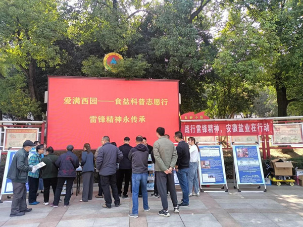 活動現(xiàn)場,通過擺放宣傳展架、低鈉鹽、生活用鹽展臺、懸掛“踐行雷鋒精神,安徽鹽業(yè)在行動”橫幅、大屏幕投放主題標(biāo)語等,營造了濃厚的活動氛圍。志愿服務(wù)隊向社區(qū)居民免費發(fā)放宣傳單頁、控鹽量勺、綠色低鈉鹽等物品,為居民如何健康用鹽答疑解惑,宣傳科學(xué)補(bǔ)碘知識,倡導(dǎo)低鈉飲食消費理念,贏得了社區(qū)居民廣泛好評。