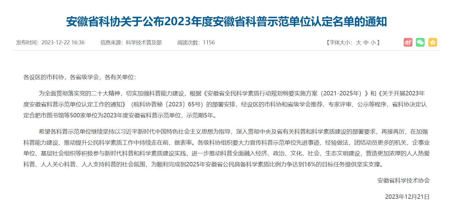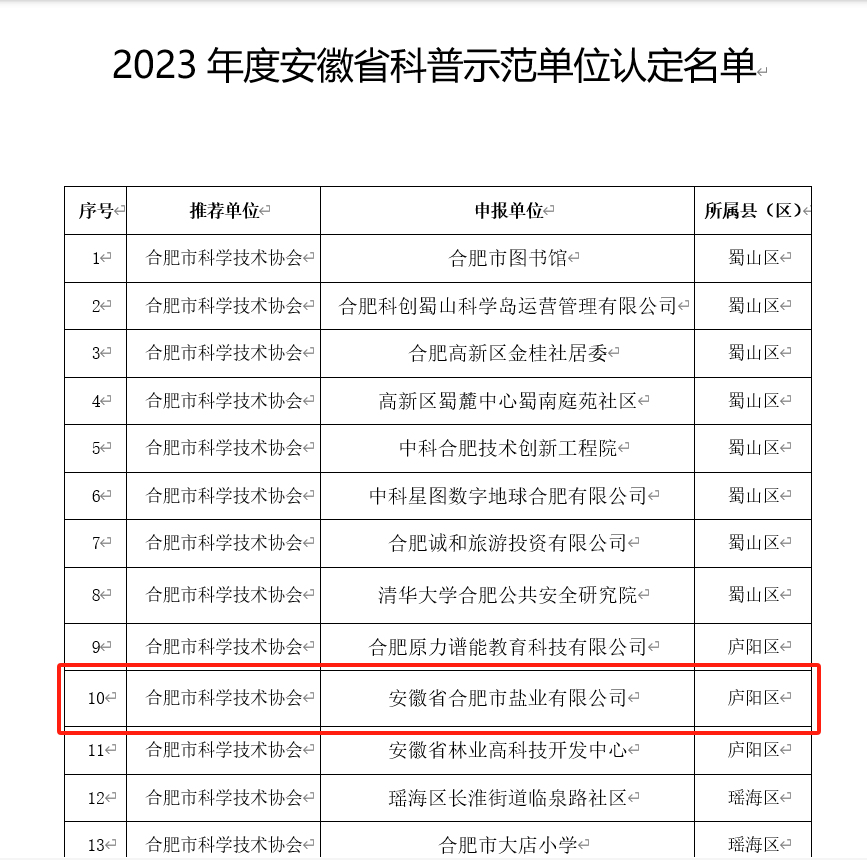 為全面貫徹落實(shí)黨的二十大精神,切實(shí)加強(qiáng)科普能力建設(shè),根據(jù)《安徽省全民科學(xué)素質(zhì)行動(dòng)規(guī)劃綱要實(shí)施方案(2021-2025年)》和《關(guān)于開展2023年度安徽省科普示范單位認(rèn)定工作的通知》(皖科協(xié)普秘〔2023〕65號(hào))的部署安排,經(jīng)設(shè)區(qū)的市科協(xié)和省級(jí)學(xué)會(huì)推薦、專家評(píng)審、公示等程序,安徽省科協(xié)決定認(rèn)定安徽省合肥市鹽業(yè)有限公司為2023年度安徽省科普示范單位,示范期5年。