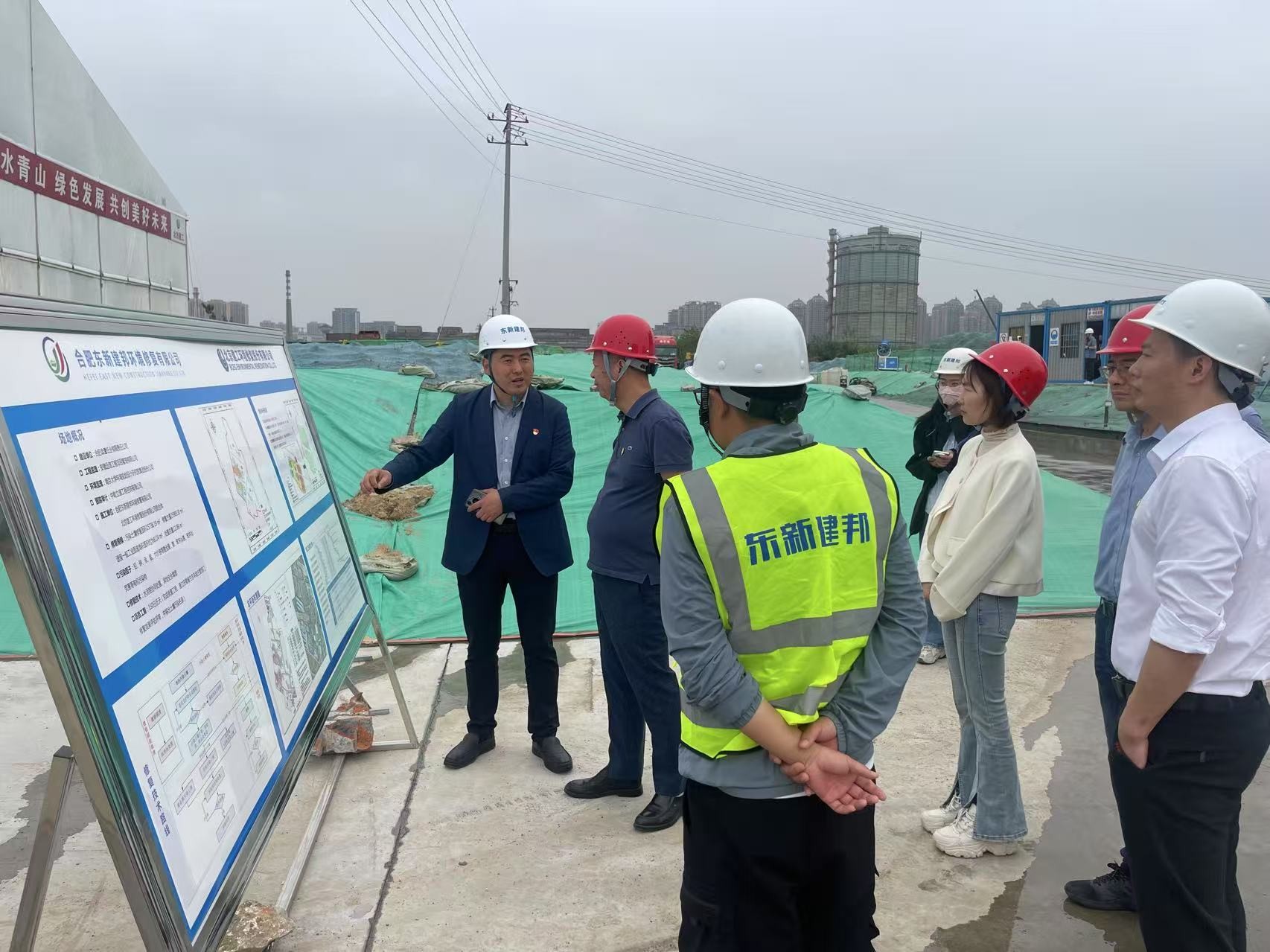 隨后,雙方深入到東新建邦環(huán)境修復公司承建的合肥造紙廠土壤修復項目現(xiàn)場。東新建邦環(huán)境修復公司副總經(jīng)理李泰平系統(tǒng)介紹了項目背景、修復技術方案、施工工藝以及目前推進過程中重難點問題與解決方案等。雙方圍繞項目施工管理、質量控制、安全保障等方面展開深度研討和經(jīng)驗分享。