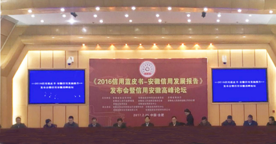 2017年2月25日,由安徽省社會(huì)科學(xué)院、安徽省經(jīng)濟(jì)和信息化委員會(huì)、安徽省商務(wù)廳、安徽省工商行政管理局、安徽省人民政府法制辦公室、安徽省人民政府金融工作辦公室、安徽省信用協(xié)會(huì)和安徽省信用研究中心聯(lián)合舉辦的《2016信用藍(lán)皮書——安徽信用發(fā)展報(bào)告》發(fā)布暨信用安徽高峰論壇在省人大會(huì)議中心召開。